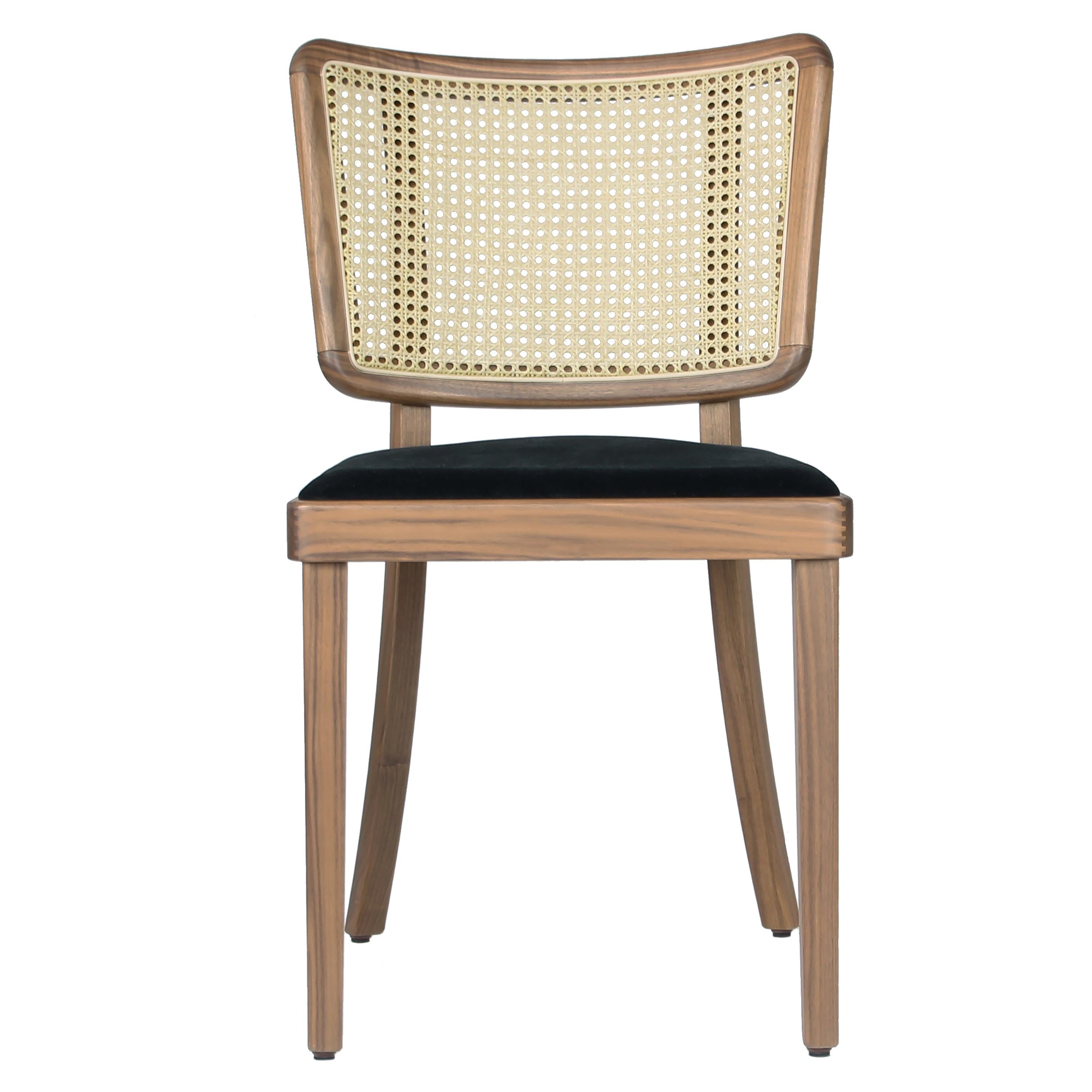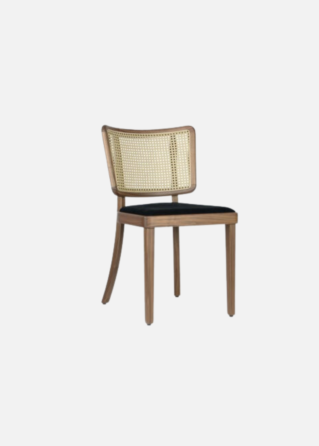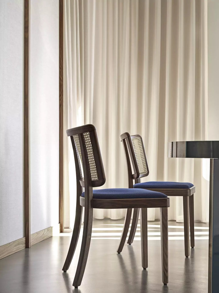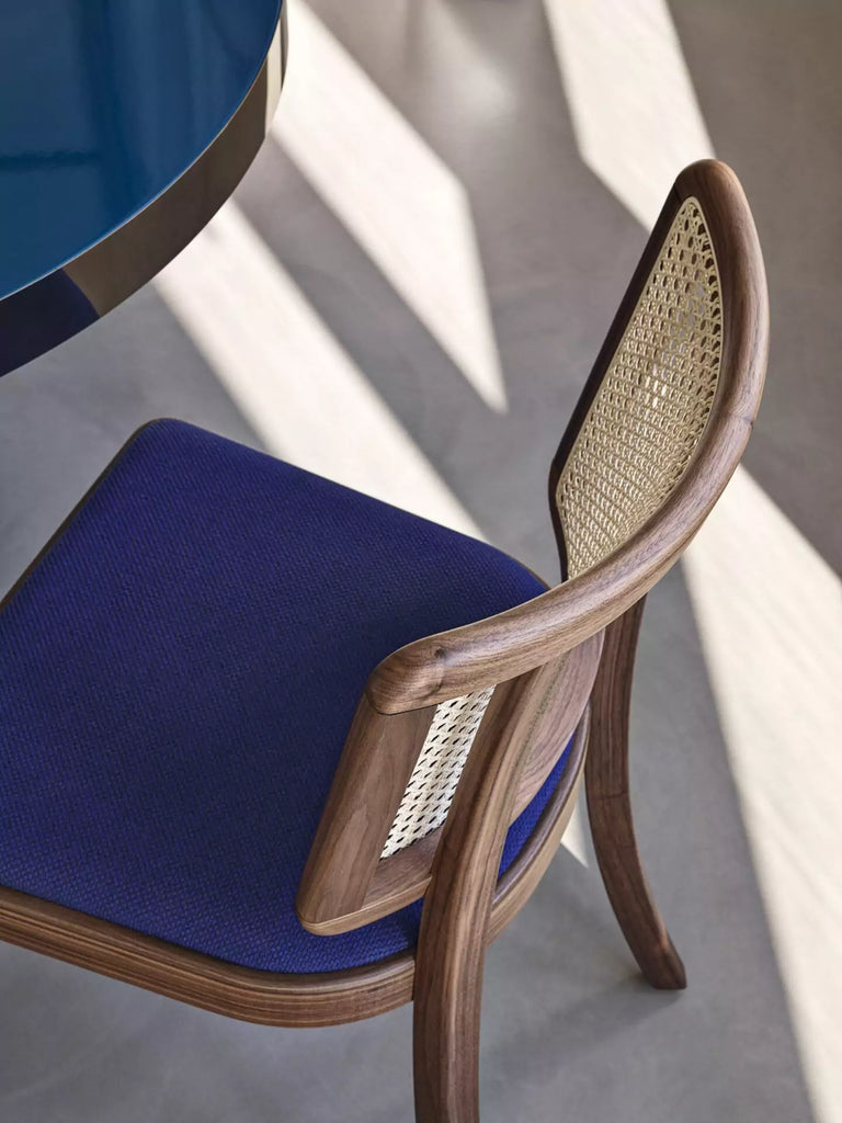 Peculiarities are the large square upholstered seat and the woven cane backrest, that just like a large fan with a bent-wooden frame, welcomes the back, ensuring great comfort.