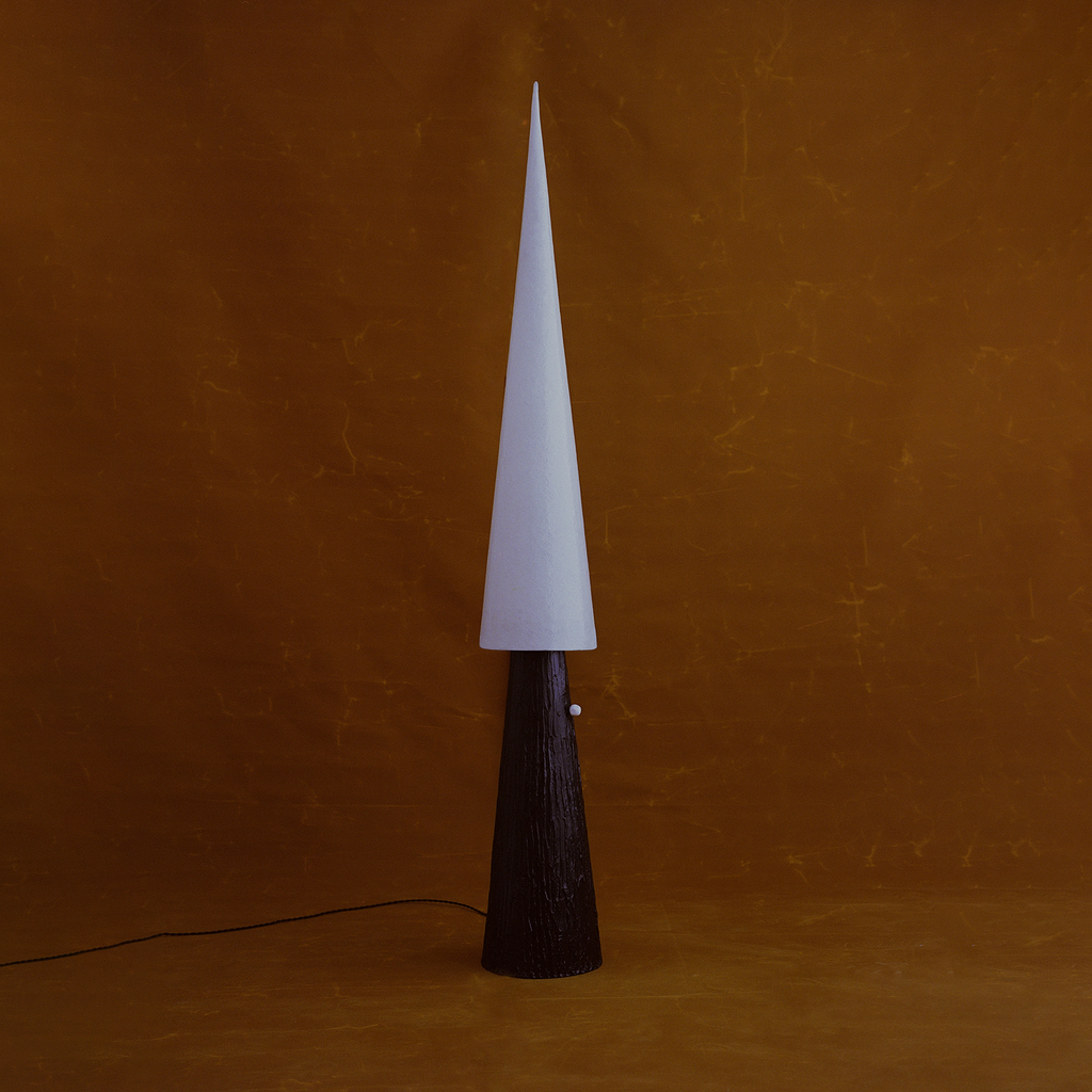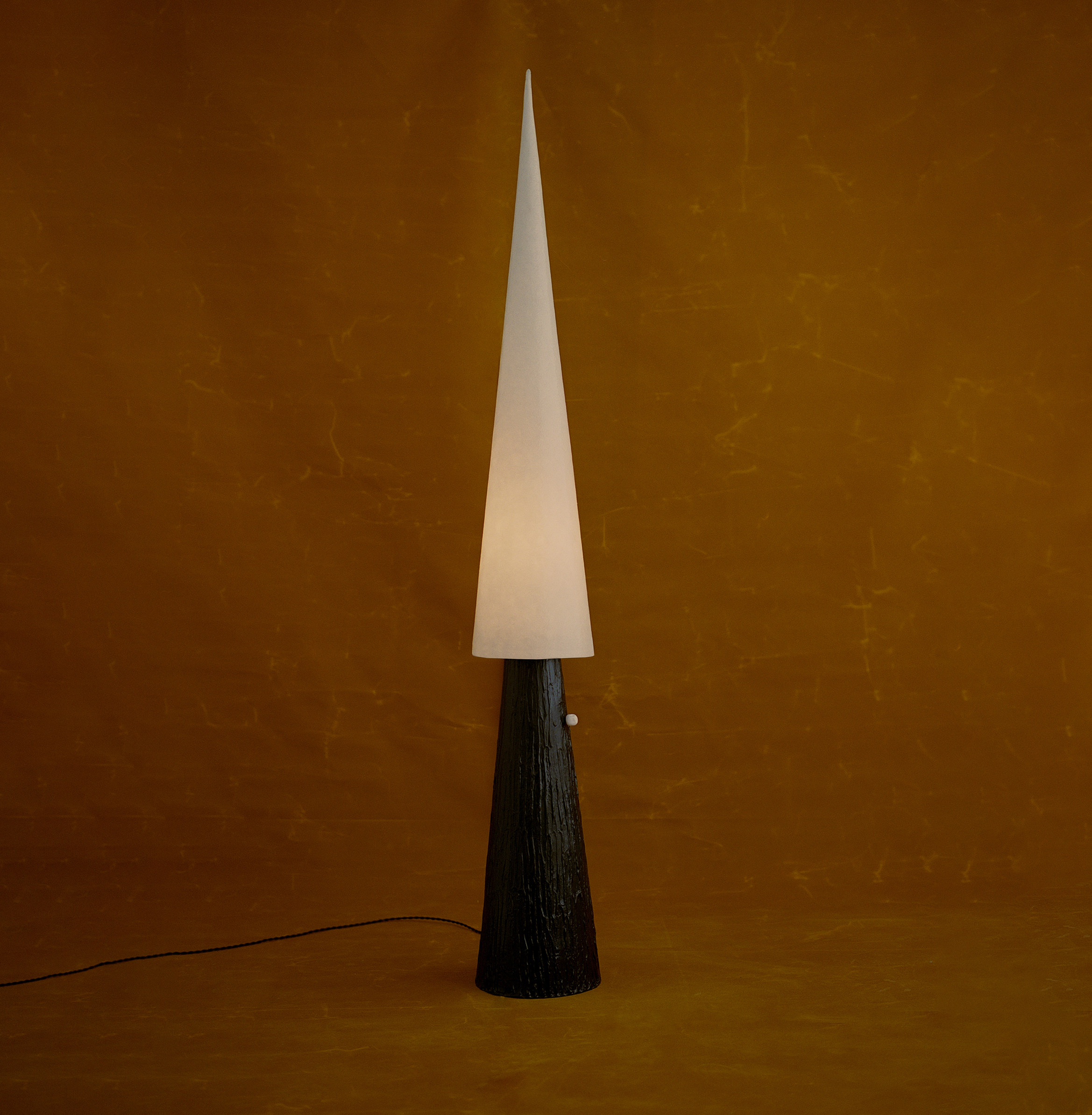 Base in handmade Fingers texture, sculptural dimmer switch, shade in seamless translucent fiberglass.