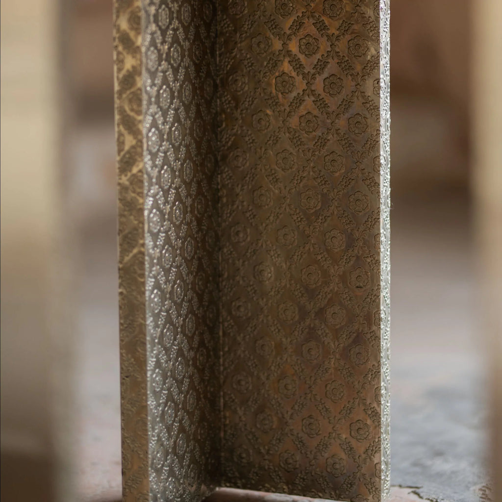 Our Z Table is a harmonious blend of functionality and ornament. Crafted with meticulous attention to detail and available in various embossing patterns, this tall rectangular table is clad in embossed metal with intricate custom made patterns available in blackened brass, satin brass, and satin germain silver, adding a touch of elegance and sophistication to any room.