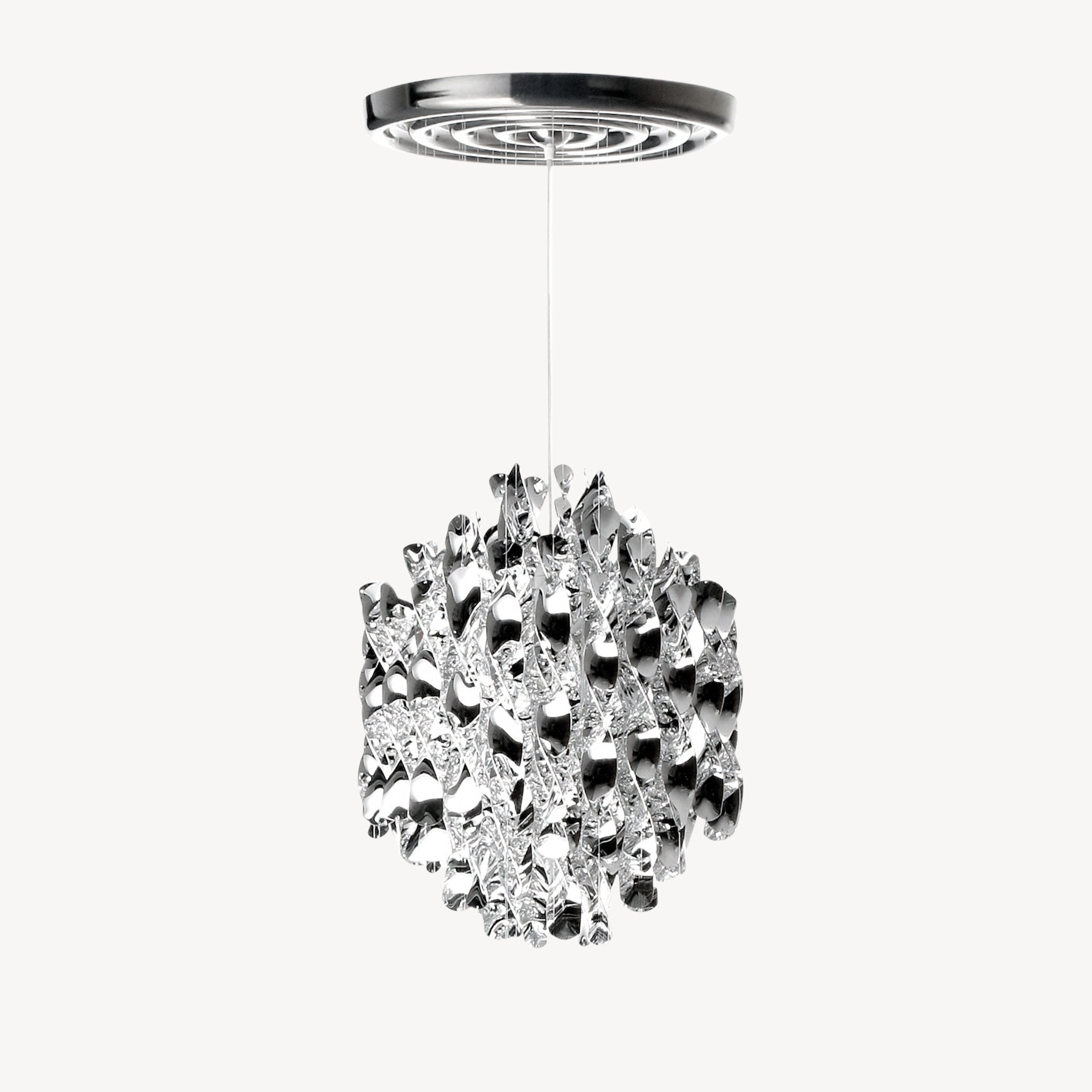 This shimmering masterpiece turns every breeze into a dance of light and gentle melodic sound. Cascading silver spirals catch reflections from every angle to brighten your space with mid-century modern flair. Expertly crafted from durable cast ABS plastic, the single cluster design hangs elegantly from a transparent cord. It is a stunning study in movement and reflection that brings Verner Panton's experimental 1969 vision right into your home.