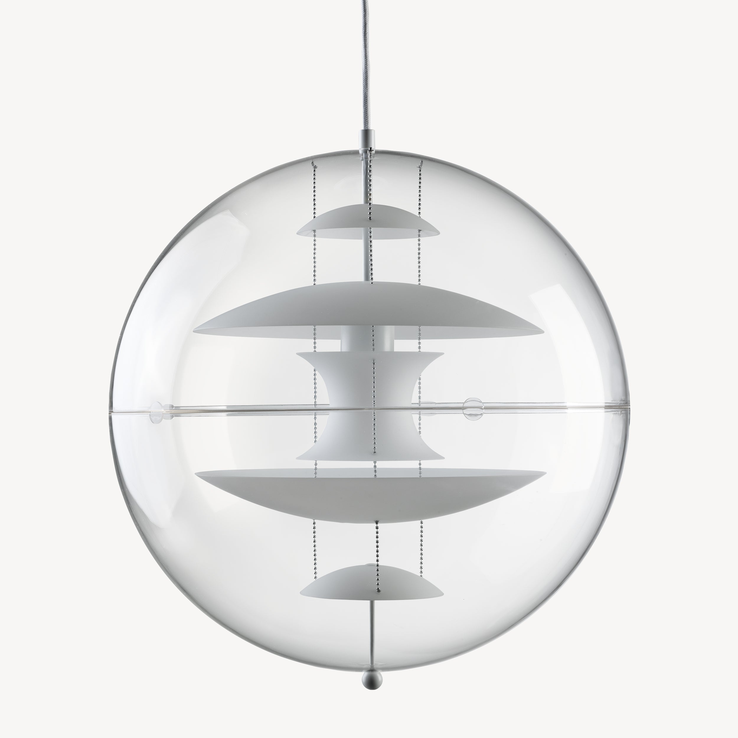 This iconic bubble of joy features five opal glass reflectors that dance inside a crystal-clear acrylic sphere. Suspended by sleek steel chains, it transforms any room into a sophisticated space age gallery with its soft, sculptural glow. Whether it's hanging solo or in a stylish cluster, this mid-century masterpiece effortlessly catches every eye in the room. You can enjoy the perfect blend of 1960s futurism and timeless elegance hanging from a 157.5-inch fabric cord.