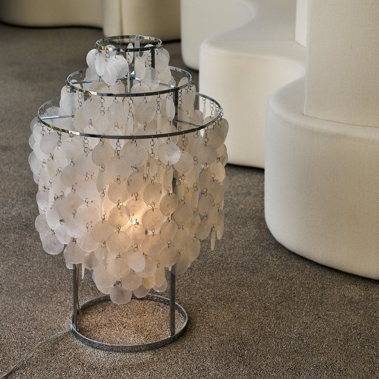 This iconic masterpiece uses delicate seashell discs to create a gentle, chiming sound and a warm, diffused glow. The sleek three-ring chrome frame provides a sturdy yet stylish home for these natural treasures. It’s a whimsical piece of history that brings a splash of 1960s joy to any bedside or desk. You’ll love how the light dances through the shells to set a perfectly relaxed mood.
